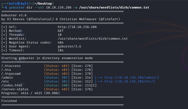 使用下面指令進行目錄爆破gobuster dir --url 10.10.158.208 -w /usr/share/wordlists/dirb/common.txt