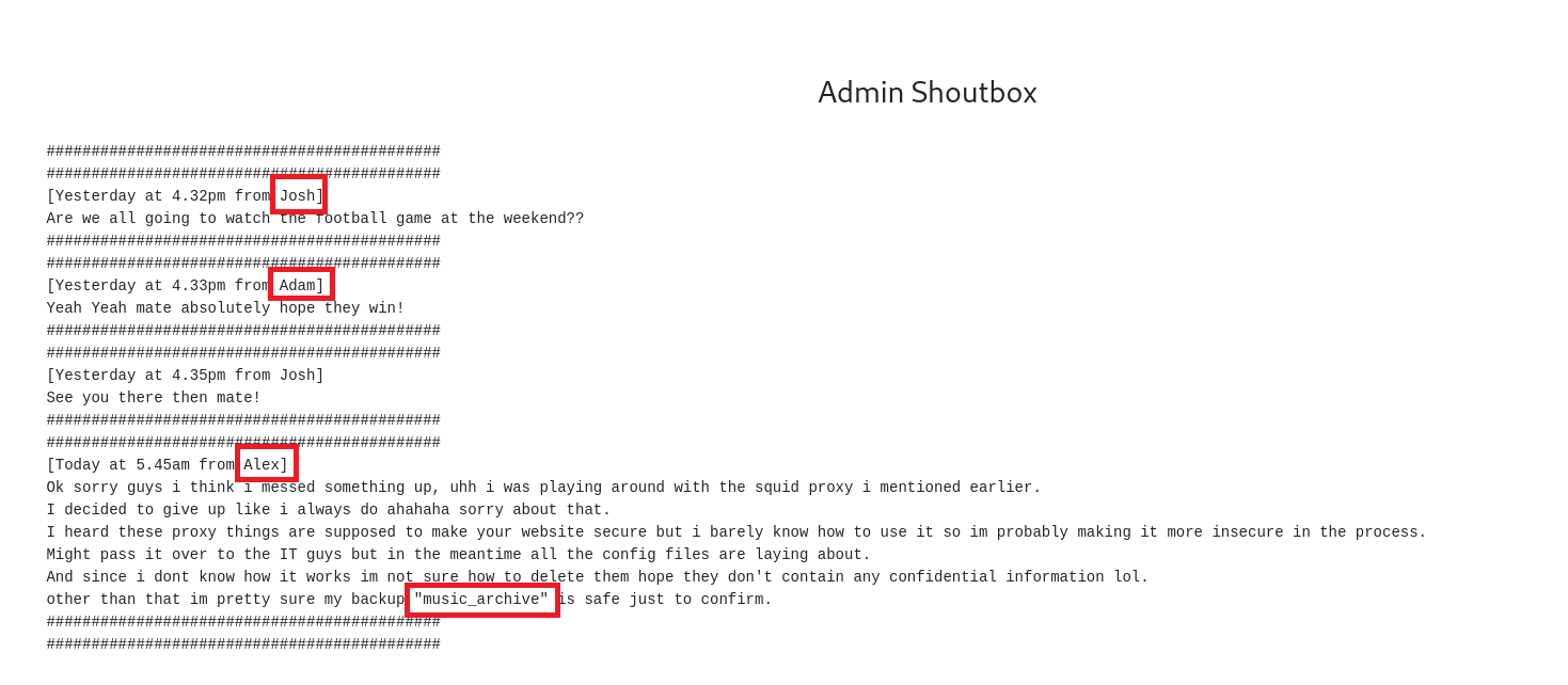 似乎從這個資訊裡得到三個名字,分別為Josh、Adam、Alex,以及一個叫做"music_archive"的備份檔名稱,但是不知道有沒有用