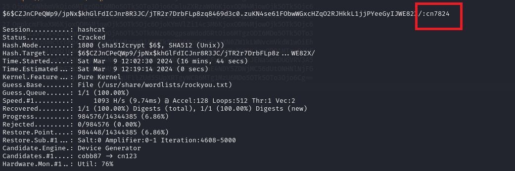 sudo hashcat -m 1800 hash.txt /usr/share/wordlists/rockyou.txt