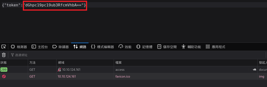 以GET的方式直接請求http://10.10.124.161/api/access,得到了一組看起來經過Base64編碼的字串
