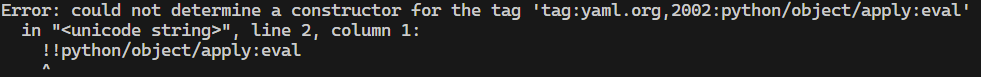 上述程式碼將會出現以下錯誤,代表其不接受 !!python/object/apply:eval tag: