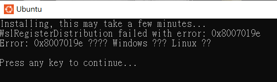 執行後依舊出現0x8007019e錯誤 😒,又參考下面討論串 WSL Ubuntu error 0x80004002